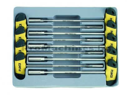 Force представя комплект от 9 броя глухи ключове шестостен с Т-дръжка, изработени от хром-ванадиева стоманена сплав, която осигурява изключителна здравина и устойчивост при работа с тях.