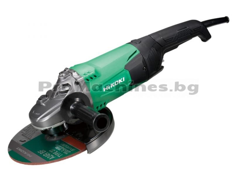 Кабелният ъглошлайф на HiKOKI има мощен 2000 W мотор е и подходящ за рязане и шлайфане. Машината е съвместима с дискове с диаметър 230 мм. и е в състояние да развие скорост от 6600 об/мин. Смяната на аксесоарите се извършва лесно с помощта на шпиндела, който се заключва. Уредът има предпазен щит, който защитава потребителя от искри и частици, които се отделят от обработвания материал, както и от парчета, при евентуално счупване на диска. Ъглошлайфът разполага с допълнителна трипозиционна ръкохватка, която улеснява управлението на уреда. Двигателят е защитен от строителен прах, благодарение на лабиринтната си конструкция.