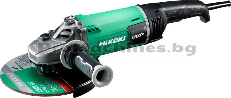 Кабелният ъглошлайф на HiKOKI притежава мощен 2400W двигател и е съвместим с дискове с диаметър 230 мм. Машината е в състояние да развие скорост от 6600 об/мин., което осигурява ефективна обработка на големи повърхности. Инструментът притежава вентилационни отвори на най-нагряващите места, което води до оптимално охлаждане на работните елементи. Шпинделът има възможност за заключване с цел лесна и безопасна смяна на шлифовъчното колело. Ъглошлайфът разполага със ситема за намаляне на вибрациите UVP.