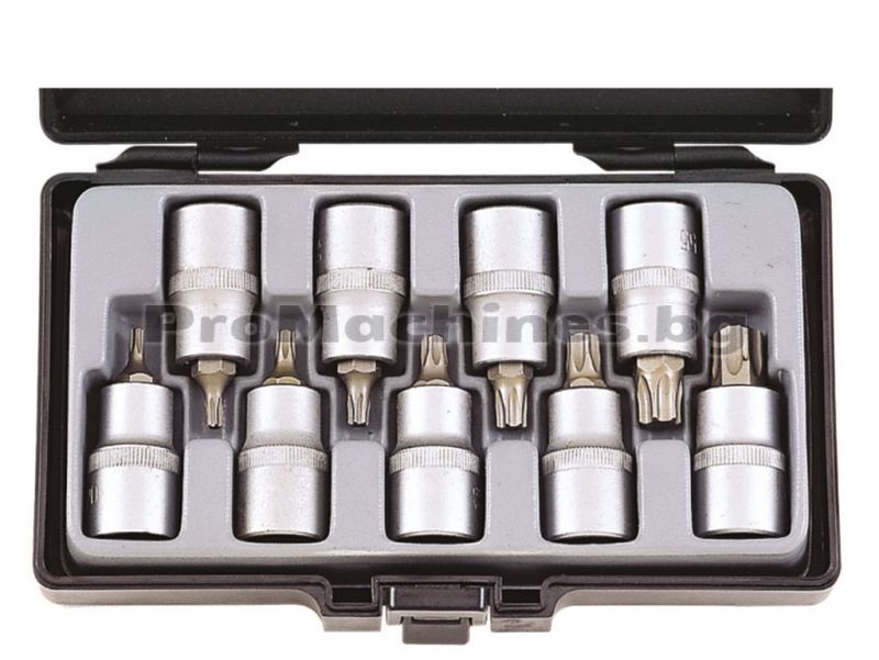 Комплект от 9 броя вложки 1/2 TORX Т20-Т60, изработени от висококачествена хром-ванадиева стомана, която осигурява изключителна здравина и устойчивост.