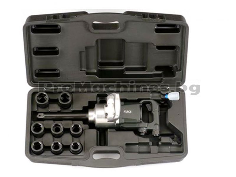 Пневматичен гайковерт 1" 2439Nm в комплект с ударни вложки. Моделът е със захват 1“ и е в състояние да развие до 4000 об/мин. Максималният въртящ момент е 2439 Nm, а работното налягане е 6.5 bar. Средният разход на въздух е не по-малко от 255 л/мин.
