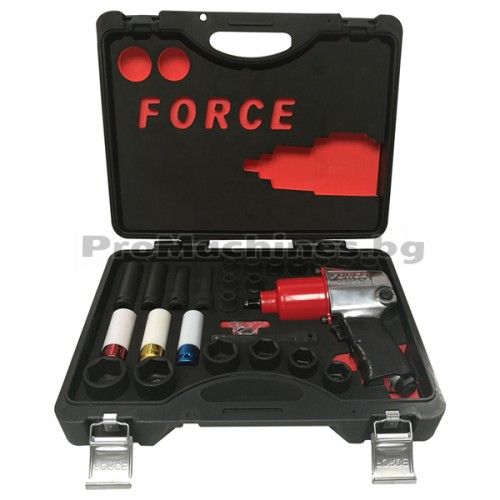 Комплект от 29 части ударен пневматичен гайковерт 1/2 814Nm с вложки. Машината притежава регулатор, който помага за регулирането на изходната мощност, както и двоен ударен механизъм. Максималният върящ момент е 814Nm, а достижимите обороти са 8500 в минута. Работното налягане на инструмента е 6.5 bar, а минималната консумация на въздух е 180 л/мин. Force 4293 се доставя в удобен куфар за лесно съхранение и пренасяне.