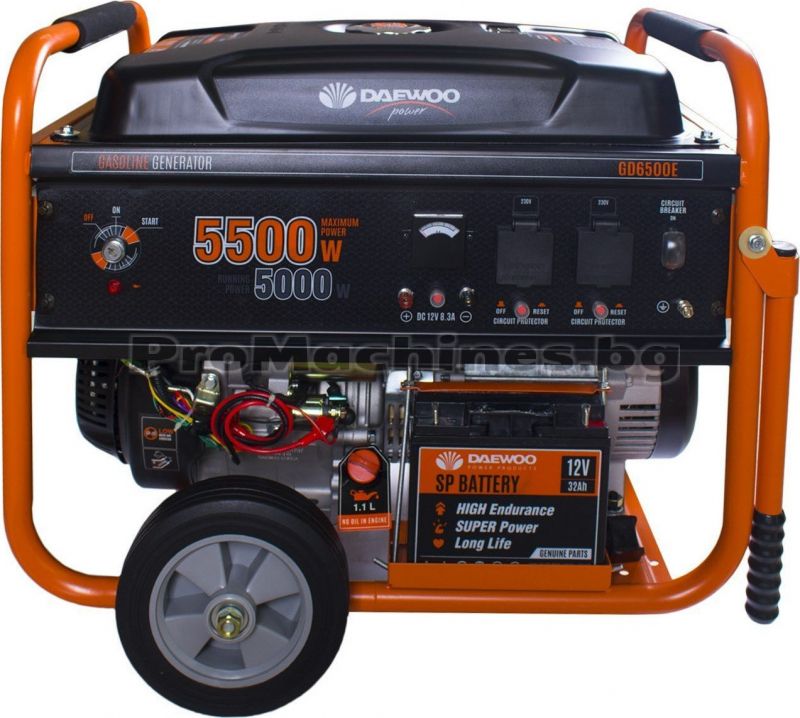 Daewoo GD7000E е бензинов генератор за ток, подходящ за употреба във Вашата къща или вила, при липса на електрозахранване за по-продължително време. Моделът се отличава с дълъг експлоатационен живот и има лесна поддръжка. Той намира приложение и при захранване на различни консуматори в работата, у дома или на къмпинг. Машитата е с електронен старт и е с 6300W максимална и 6000W работна мощност. За по-лесното транспортиране на генератора са осигурени 2 броя колела. Специален датчик следи нивото на маслото в резервоара.