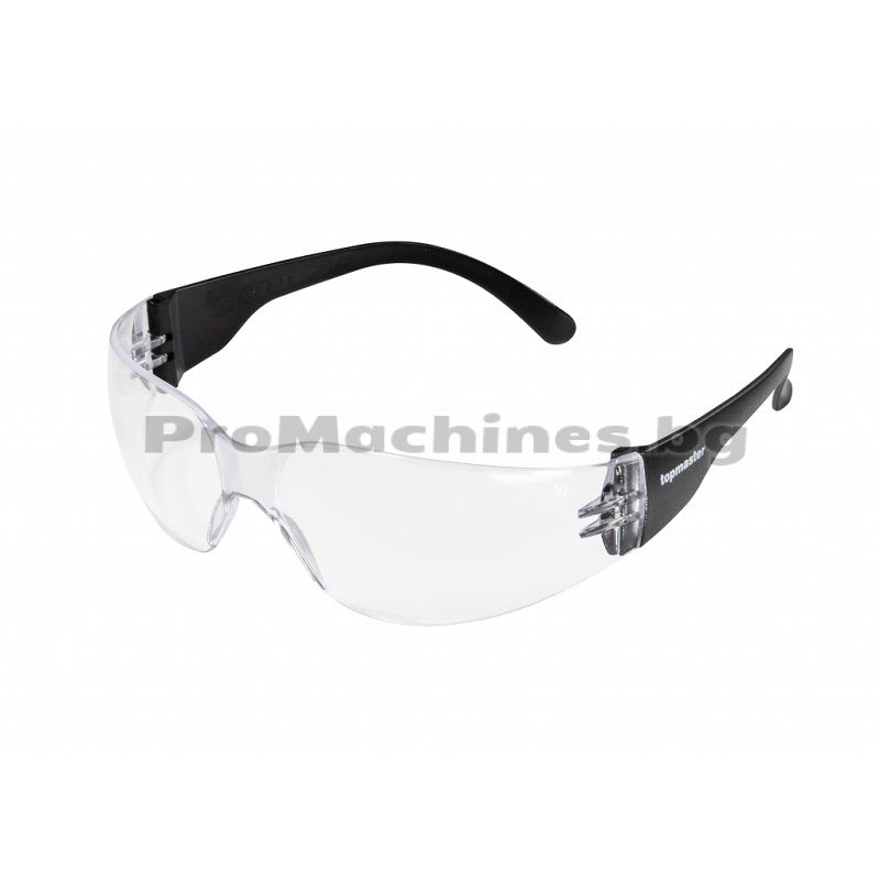 Предпазни очила с прозрачни стъкла на марката Top Master Pro. Моделът има поликарбонатни лещи, които следват извивката на главата и осигуряват перфектна видимост, както и ефективна защита от удар и вредните UV лъчи. SG02 е със защита от прахови частици, с големина до 5 микрона.