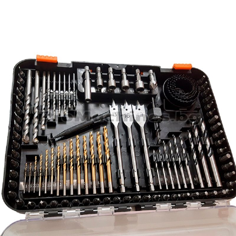 Комплект от 100 броя свредла на марката Daewoo. Моделът се доставя в удобна кутия за лесно съхранение.