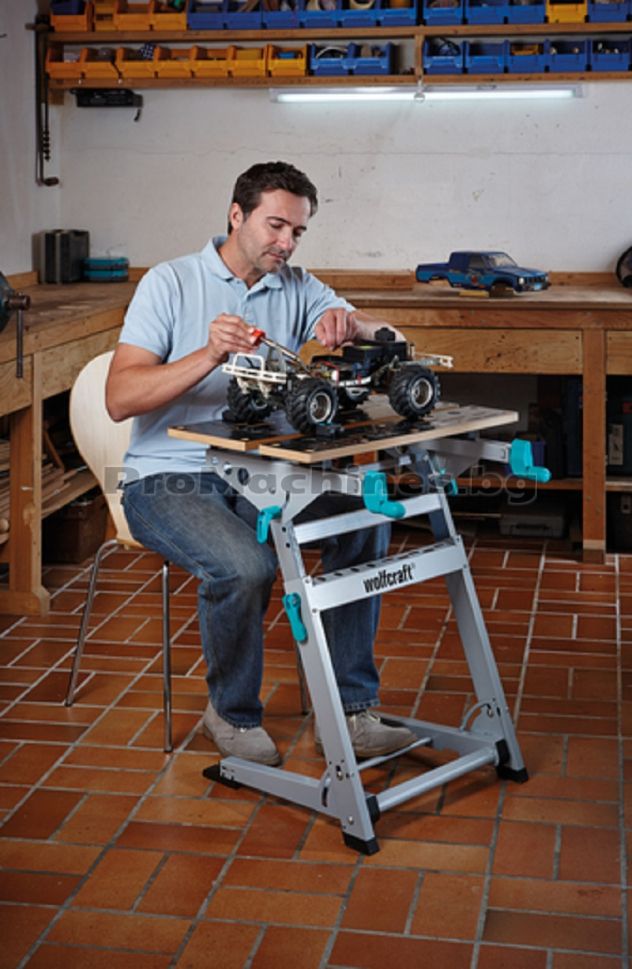 Wolfcraft Master 700 е ергономична многофункционална работна и стягаща маса, която може да се ползва и като маса за инструменти. MDF плотът е с дебелина 19мм и може да накланя безсепенно от 0 до 70 градуса. Той позволява монтаж на потапящи и скосяващи циркуляри, както и на стойки за бормашини. Между дървените плотове на работната повърхност могат да бъдат монтирани работни детайли с широчина на стягане до 13см. Наличието на стягащи челюсти позволява прилагането на по-големи широчини на стягане до 43.5см. Масата има възможност за пружинно безстепенно регулиране на височината, така че да отговаря на височината на оператора. Моделът се сгъва компактно и не заема излишно място в домашната работилница. Wolfcraft Master 700 е с тованосимост до 150 кг.