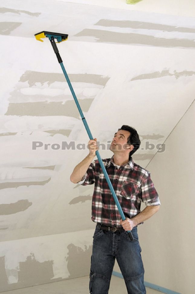 Телескопична дръжка за кръгъл шайф (арт. № 4052000), подходяща за шлайфане на тавани, наклонени повърхности и стени от сухо строителство. Моделът се разтяга в диапазона от 1.20 до 2 метра, което го прави ценен помощник при работа над глава и в същото време предпазва от вдишване на отделяния прах по време на работа. Телескопичната дръжка е подходяща за употреба и с валяци за боядисване. Това става чрез включения за тази цел редуктор.