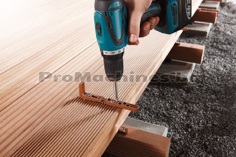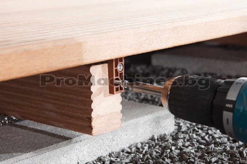 Комплектът съдържа 60 винта Torx TX 20 от благородна стомана и 10 съединяващи елемента за първата и последната дъска, които осигуряват чист завършек на декинга и позволяват невидимо закрепване на дъската към предния ръб на носещата греда.