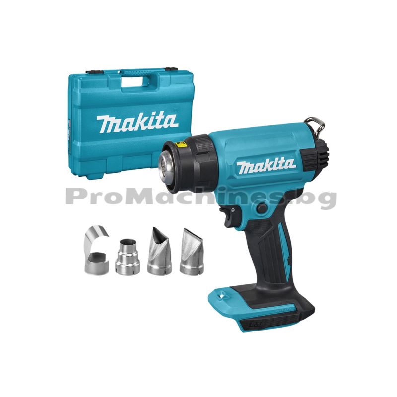 Пистолет за горещ въздух акумулаторен 18V без батерии - Makita DHG180ZK е надежден и функционален инструмент, който ви позволява да работите при отсъствие на електричество. Работи със стандартни батерии 18V Li-Ion на Makita, които не са включени в комплекта.
