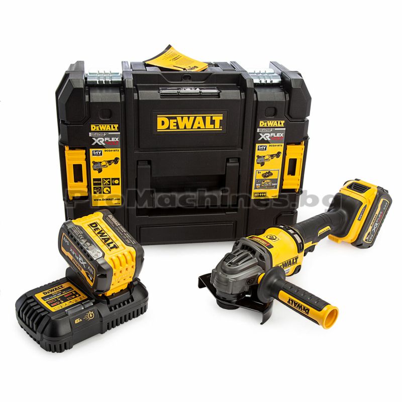 Ъглошлайфът на DeWalt DCG418T2 има напрежение 54V и капацитет на батерията 6Ah. Има вградена защита от претоварване и притежава плавен старт. Скоростта без товар е 9000 об./мин, а размера на диска е 125 мм. В случай на заклинване на диска, машината има автоматична спирачка. Доставя се в куфар заедно с 2х6Ah батерии и зарядно устройство.
