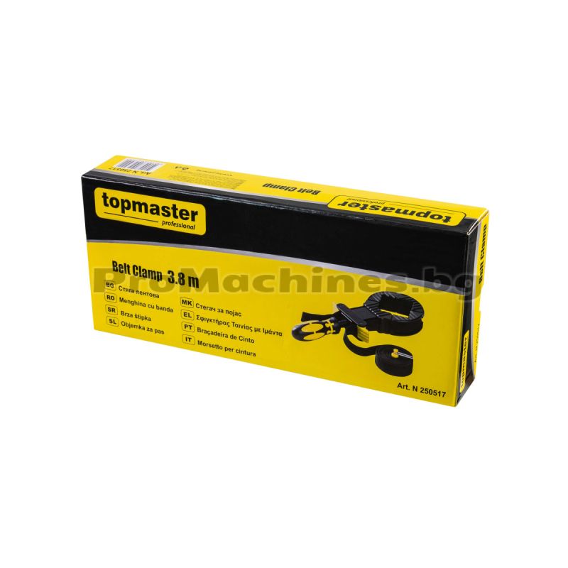 Лентовата стяга на Top Master Pro представлява висококачествена лента за стягане, предназначена за професионална употреба. Тя е с дължина 3.8 метра и е изработена от здрав материал, който осигурява здравина и устойчивост. Стягата е снабдена с механизъм за лесно стягане и освобождаване, което я прави удобна и лесна за използване. Осигурява безпроблемно захващане на предмети с квадратна или неправилна форма, без да уврежда елемента. Стягата разполага с 4 ъглови скоби. Доставя се в картонена кутия.