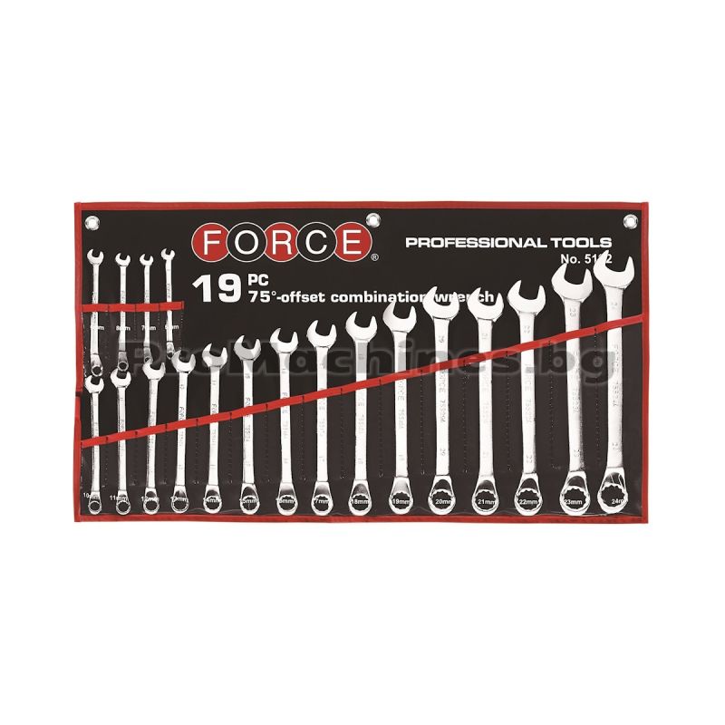 Комплектът от звездогаечни ключове 75⁰ Force 5192 е комплект за всеки професионален механик или домашен майстор, който се нуждае от надеждни и удобни гаечни ключове. Включва 19 броя ключове с отворен край, което ги прави универсални и подходящи за разнообразни приложения. Ключовете са с размери от 6 мм. до 24 мм., включително, което покрива широк спектър от задачи и разнообразни размери на болтове и гайки. Техните звездогаечни профили и ъгъл на наклон 75⁰ предоставят по-голяма сила на затягане и улесняват достъпа до труднодостъпни места.
