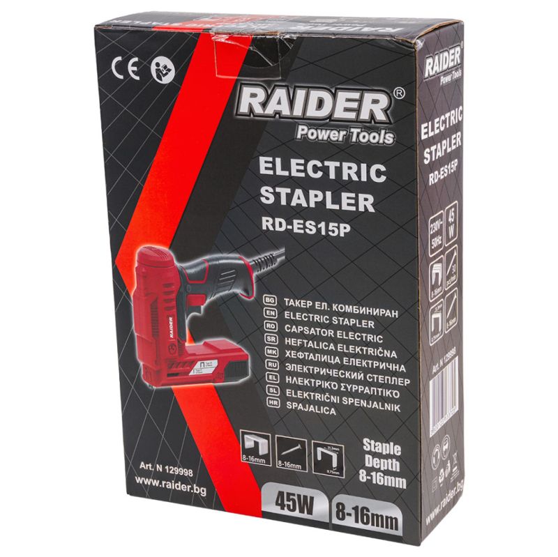 Машините на Raider имат широка популярност не само сред домашните майстори, но и в професионалните строителни среди. Гамата от предлаганите инструменти, може да задоволи нуждите на всеки потребител, в зависимост от изискванията и мащаба на работа. Електрическият такер RD-ES15P е комбинирана машина, предназначена за работа със скоби и пирони. Инструмента е подхоящ за закрепване и захващане на кабели, килими, тапицерия, изолационни материали, покривни материали и други. Ергономичният му дизайн го прави удобен за работа на трудно достъпни места.