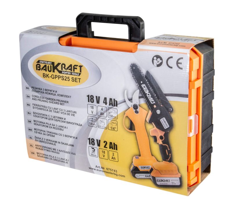 Baukraft представя комбиниран комплект BK-GPPS25 съдържащ 2 инструмента - Акумулаторна резачка и лозарска ножица. Комплектът разполага с две батерии с капацитет от 2 Ah и 4 Ah, както и 18V зарядно устройство подходящо за тях.