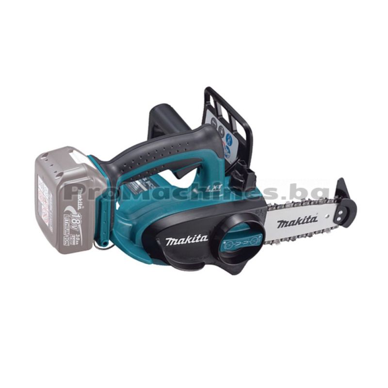 Акумулаторен верижен трион Makita разполага с автоматично смазване на веригата. Ключ за блокиране предотвратява случайното включване на инструмента.