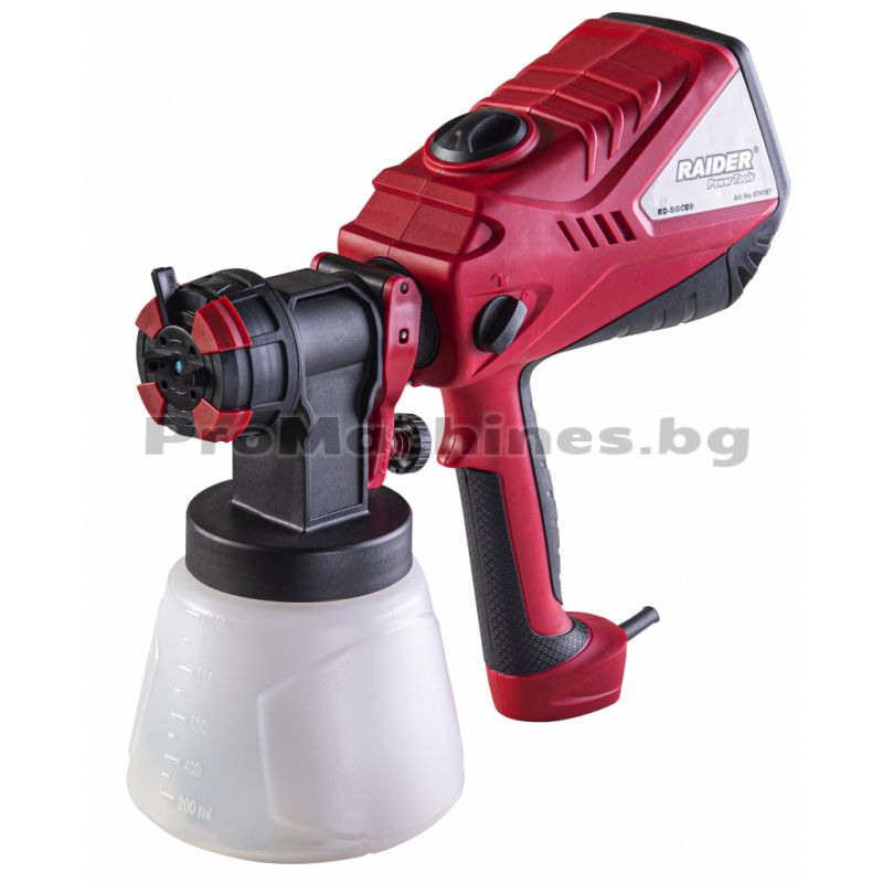 Пистолетът на Raider е подходящ зананасяне на бои, политури, консерванти за дърво, гланц, защитно покритие срещу корозия, защитно покритие за дърво и други. Моделът притежава 650 W мотор и е с регулируем дебит на въздуха максимум 1.2 литра в минута.RD-SGC09 има възможност за регулиране на ветрилото на пръскане и дебита на боята. Резервоарът за боя е с вместимост 1000 мл.
