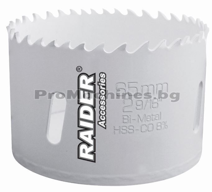 Боркороната на Raider е изработена от първокачествена стомана HSS (High-speed Steel), легирана с 8% кобалт. Тя е подходяща за пробиване на инокс и метал.