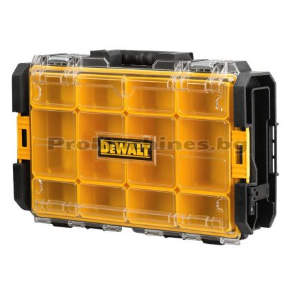 Куфар за инструменти, част от системата Toughsystem на Dewalt. Куфара предоставя възможност за съхранение на дребни консумативи и инструменти в комплекта от ванички , прозрачният капак от здрава пластмаса улеснява видимостта до съхранените компоненти и така спестява време на работещия.