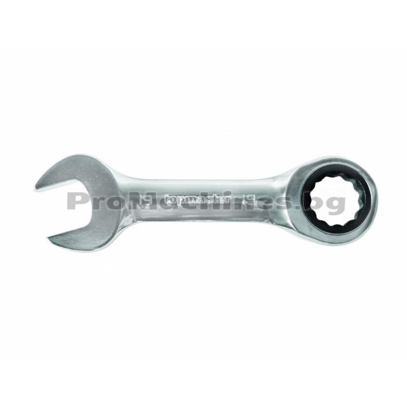 Top Master Pro представя къс звездогаечен ключ с тресчотка 10мм., изработен от горещо щампована висококачествена хром-ванадиева стомана. Моделът има хром-никелово антикорозионно покритие и е оборудван с прецизен тресчотен механизъм със 72 зъба, който позволява реверсивен ъгъл на рамото от 5°. Ключът е 60% по-компактен в сравнение със стандартните модели.