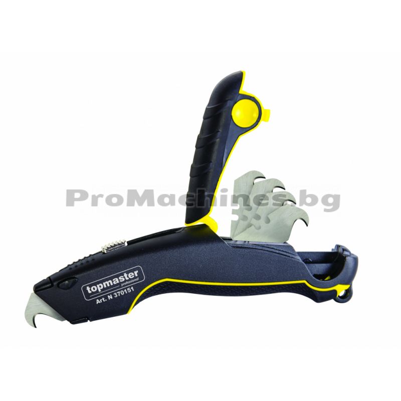 Top Master Pro представя макетен нож тип кука с 5 остриета. Моделът има метално тяло, заключващ механизъм и е подходящ за рязане на хартия, найлон, фолио, стреч фолио, гума и други по-тежки материи.