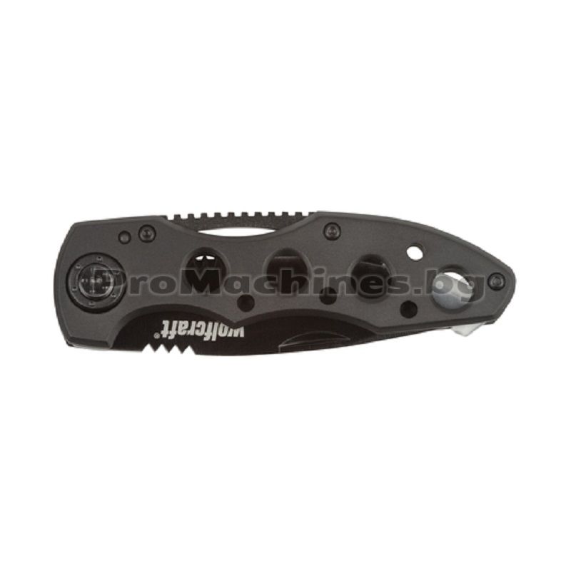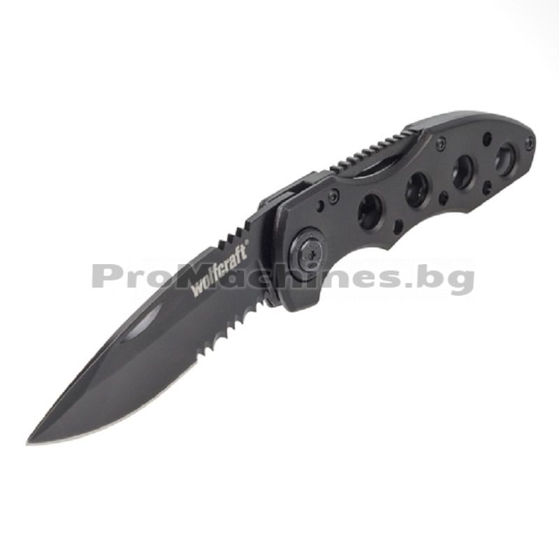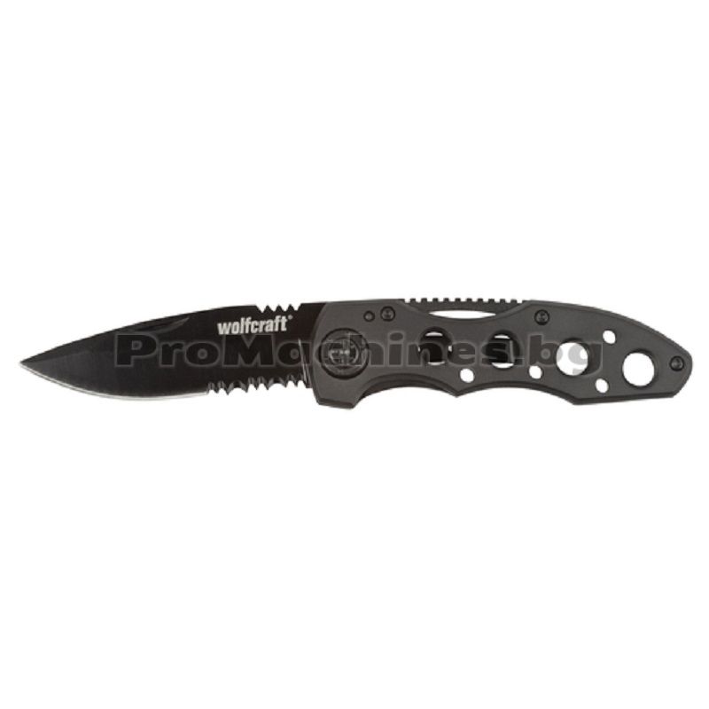 Назъбен сгъваем нож 75мм., подходящ за рязане на дърво, клон, връв и шнур. Wolfcraft 4289000 е перфектен избор при къмпингуване, хоби и занаятчийски дейности. Металният корпус е с алуминиево покритие и има назъбено острие. Механиката на ножа предпазва от наранявания при сгъване и разгъване. С цел максимална безопасност е препоръчително работата с инструмента да се извършва с двете ръце.