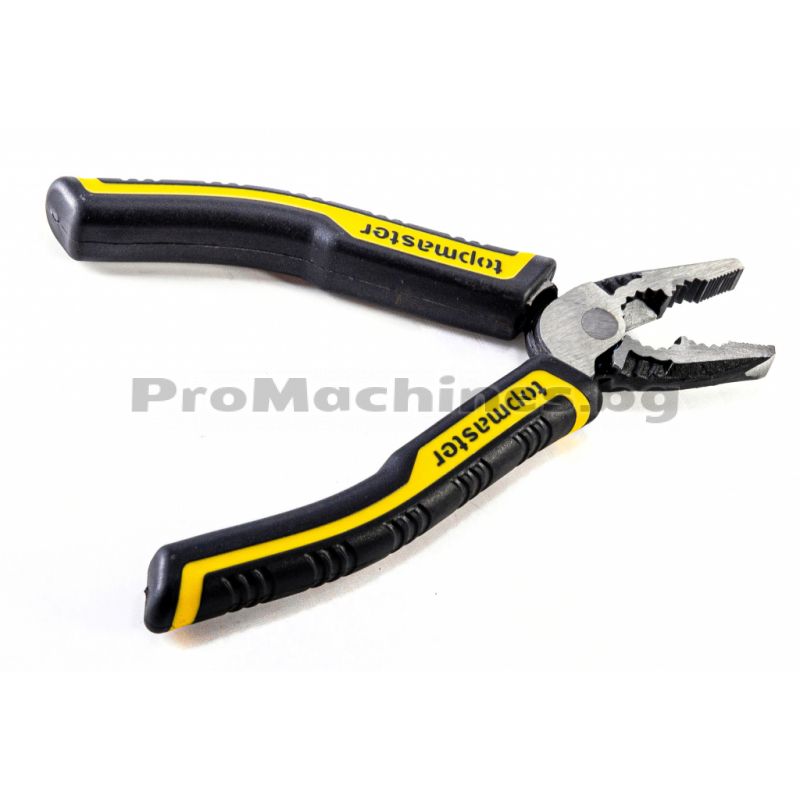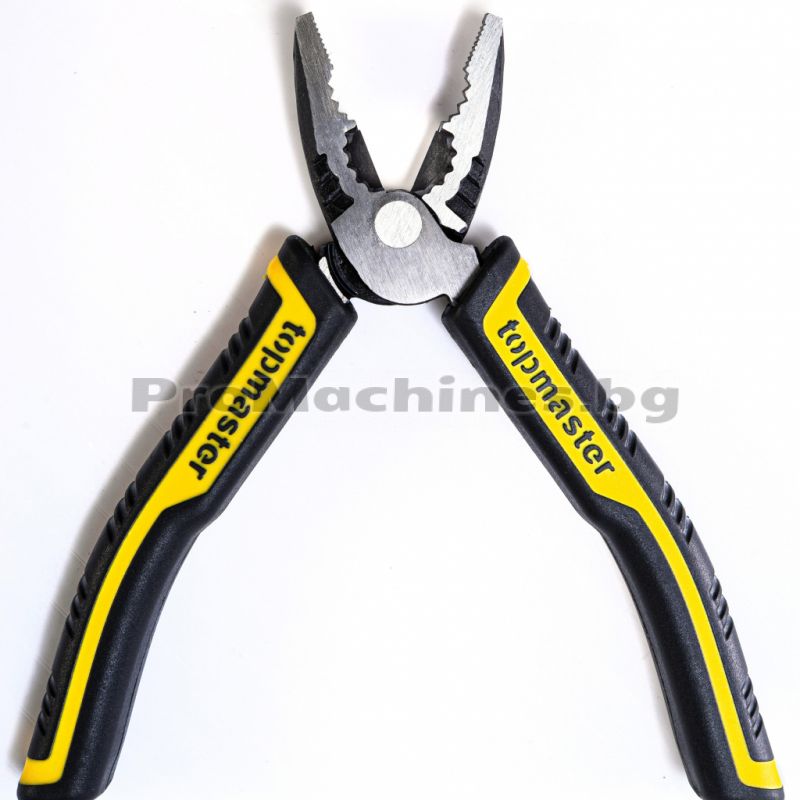 Top Master Pro представя комбинирани клещи 160 мм., изработени от хром-ванадиева стомана, която придава здравина и предпазва от корозия. Ръкохватките са устойчиви на антифриз и петролни продукти. Моделът има High leverage 35% по-малко усилие от стандартния модел. Закаляването на режещите ръбове е 58-63 HRC, а закаляването на тялото на клещите е 43-48 HRC.